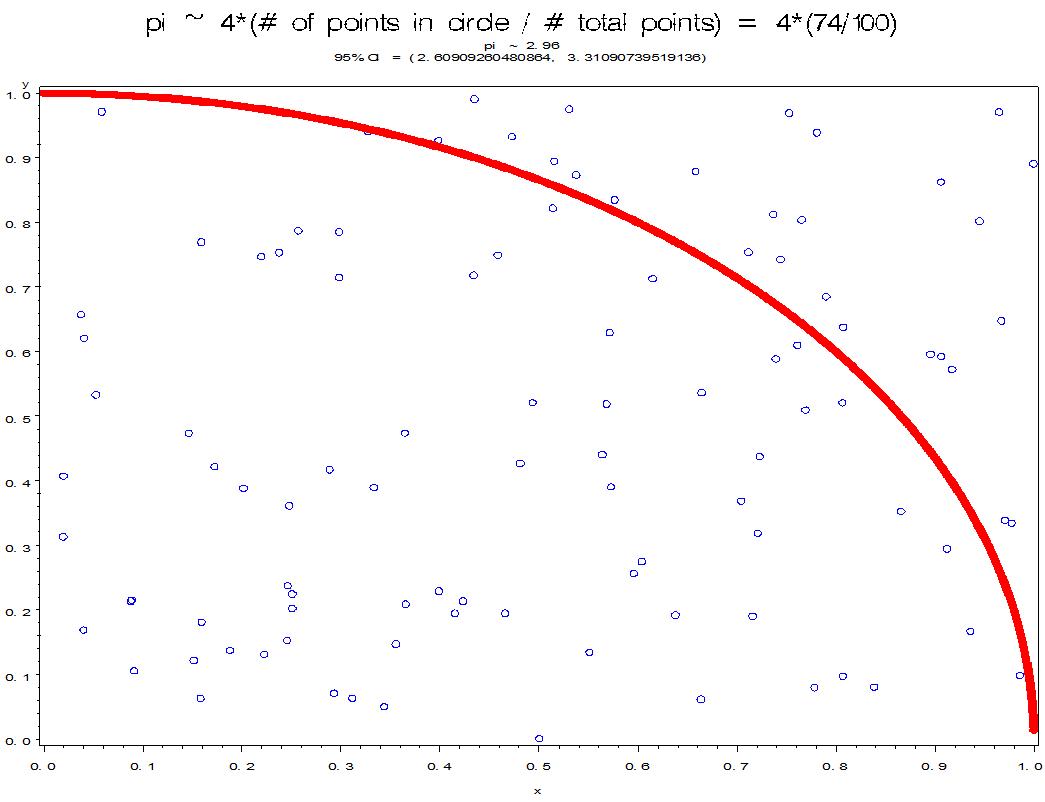 As an illustration of MCI, let's estimate the area of a circle with radius 1. Recall that the formula for the area of a circle with radius r is A = pi*r2, so with r = 1, A = pi. The equation of a circle of radius r, centered at the origin, is r2 = x2 + y2. For a unit circle, r = 1, so we get 1 = x2 + y2. Note that f(x)=(1-x2).5 is the quarter of a unit circle in the upper-right quadrant. Therefore, the area under this curve in the upper-right quadrant, multiplied by 4, would be an estimate of pi.